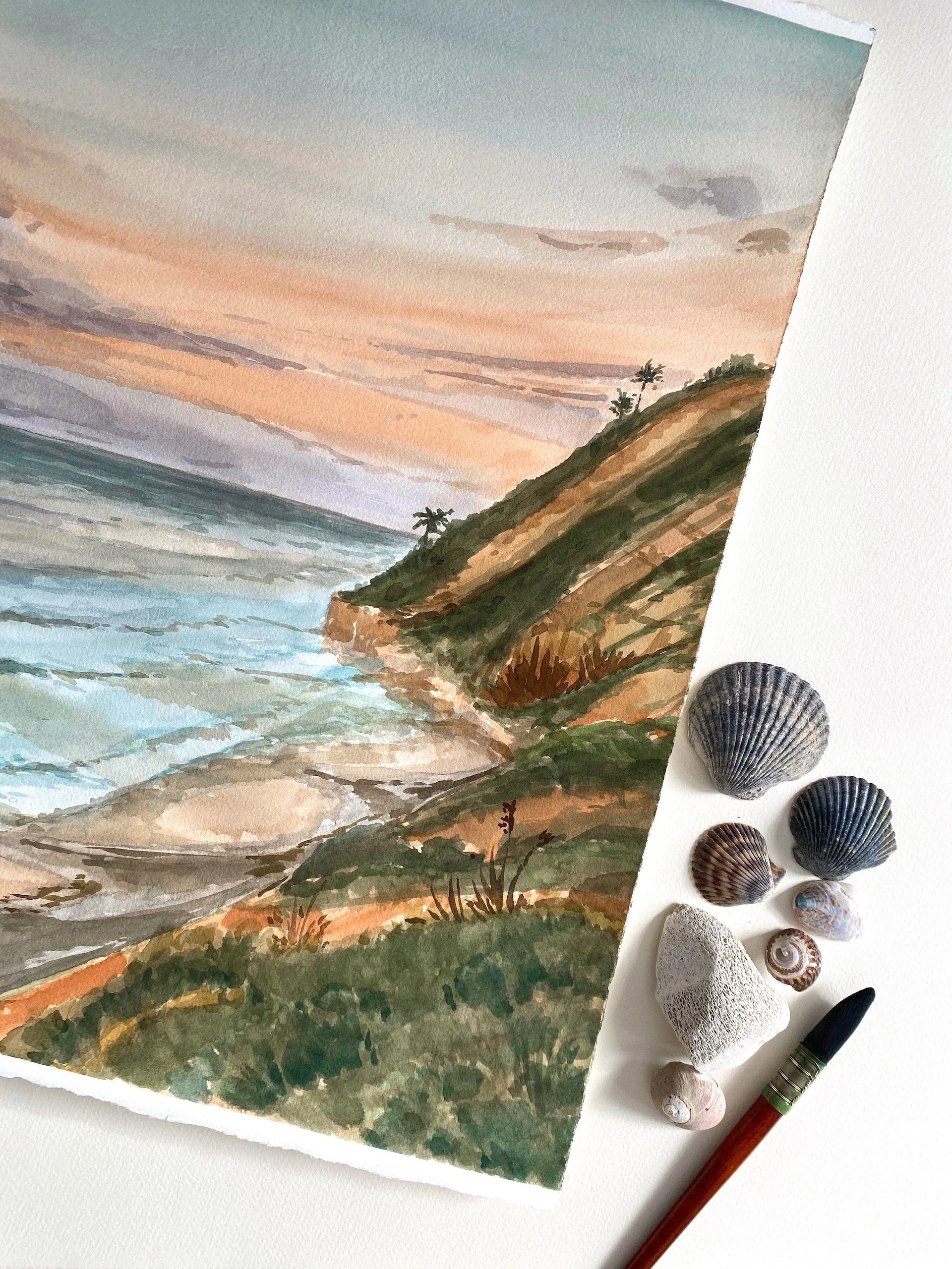 This painting flowed into creation after the most refreshing trip to Southern California during the winter of 2023. I spent almost every day at the beach, no matter the weather, soaking in the peaceful sounds of gentle waves, exploring tide pools, and gathering little treasures in the washed up winter beaches.