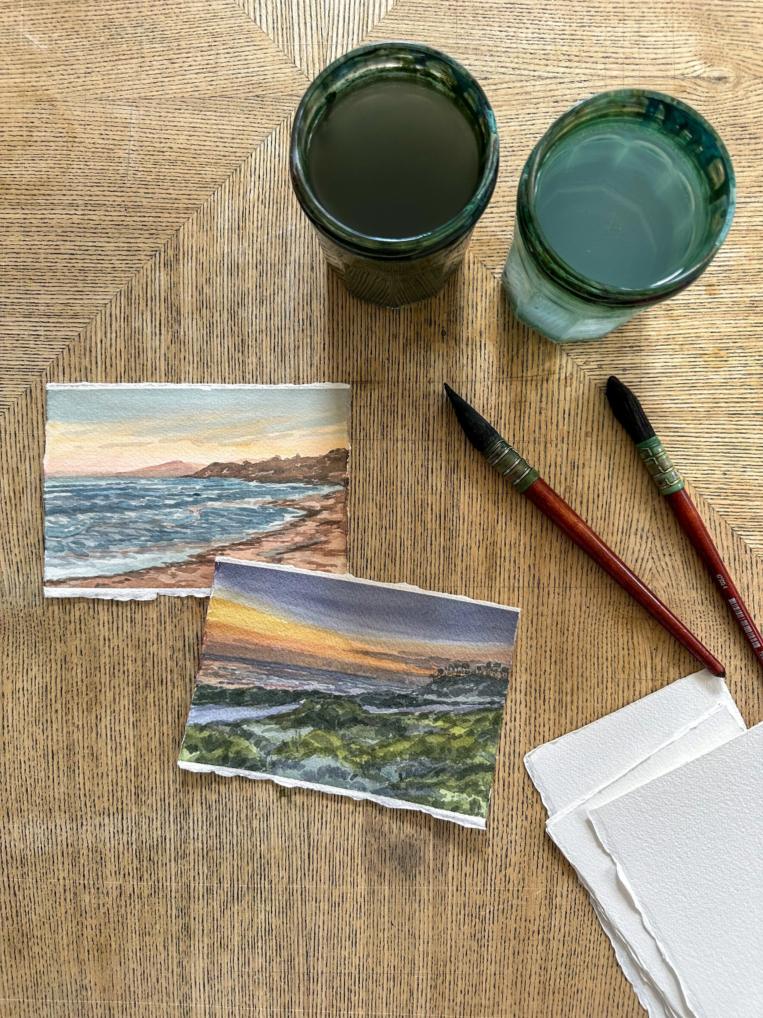 After our visit to Tofino, last summer, I had a vision of creating 6 large 24x36" horizontal watercolour paintings that transport you to the rugged Canadian coast. I've been enjoying painting the serenity of glowing West Coast sunsets, wind swept trees, and foggy coastal atmospheres. This collection has just begun, so stay tuned for updates.