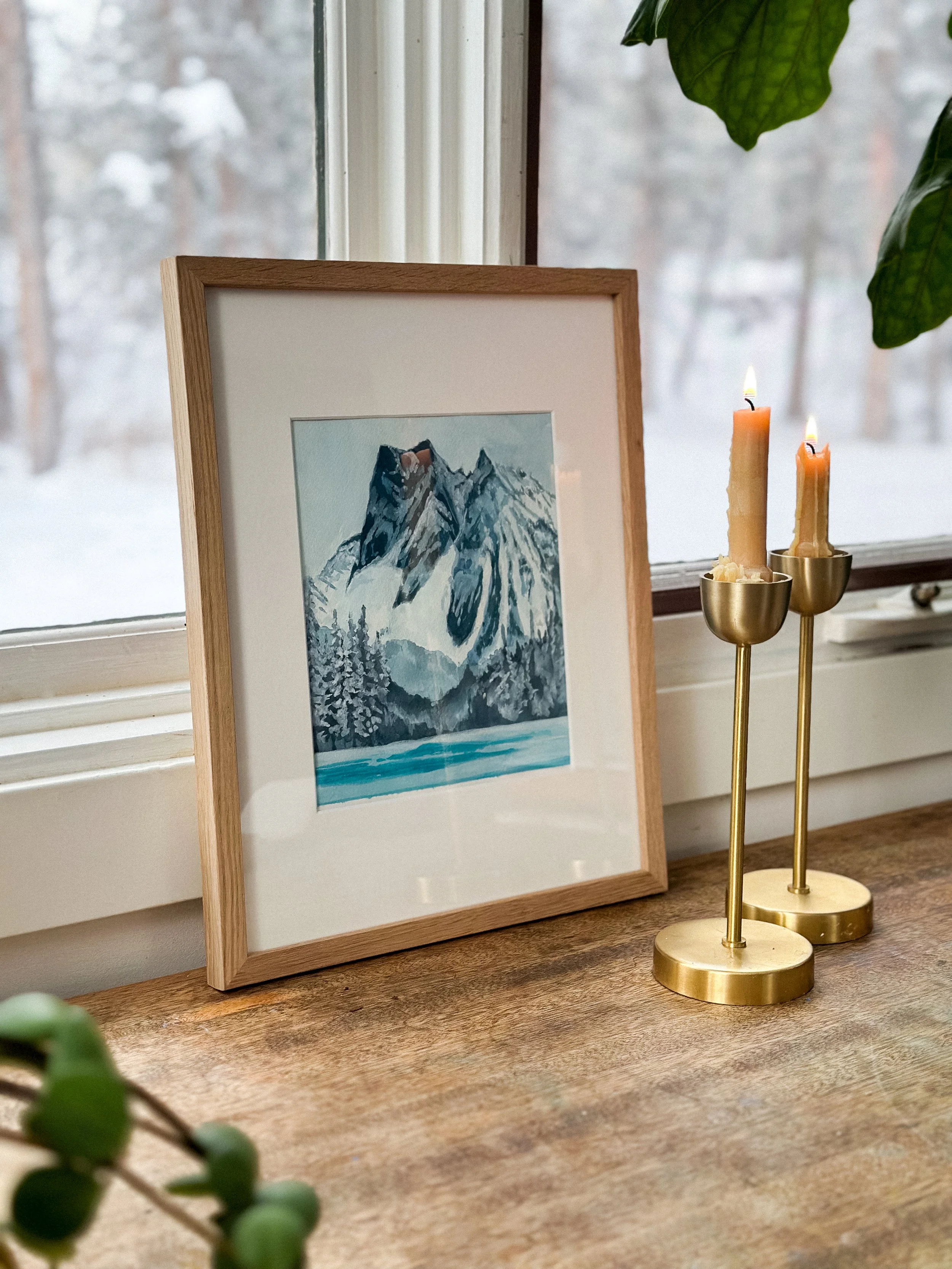 What began as an experiment in play, became a beautiful framed original. Like vintage postcards sent from time spent in the Canadian Rockies in winter, this gouache painting hold a sense of nostalgia that can only be found in the peace of the mountains. This painting is my representation of Moraine Lake in Banff National Park during winter.
